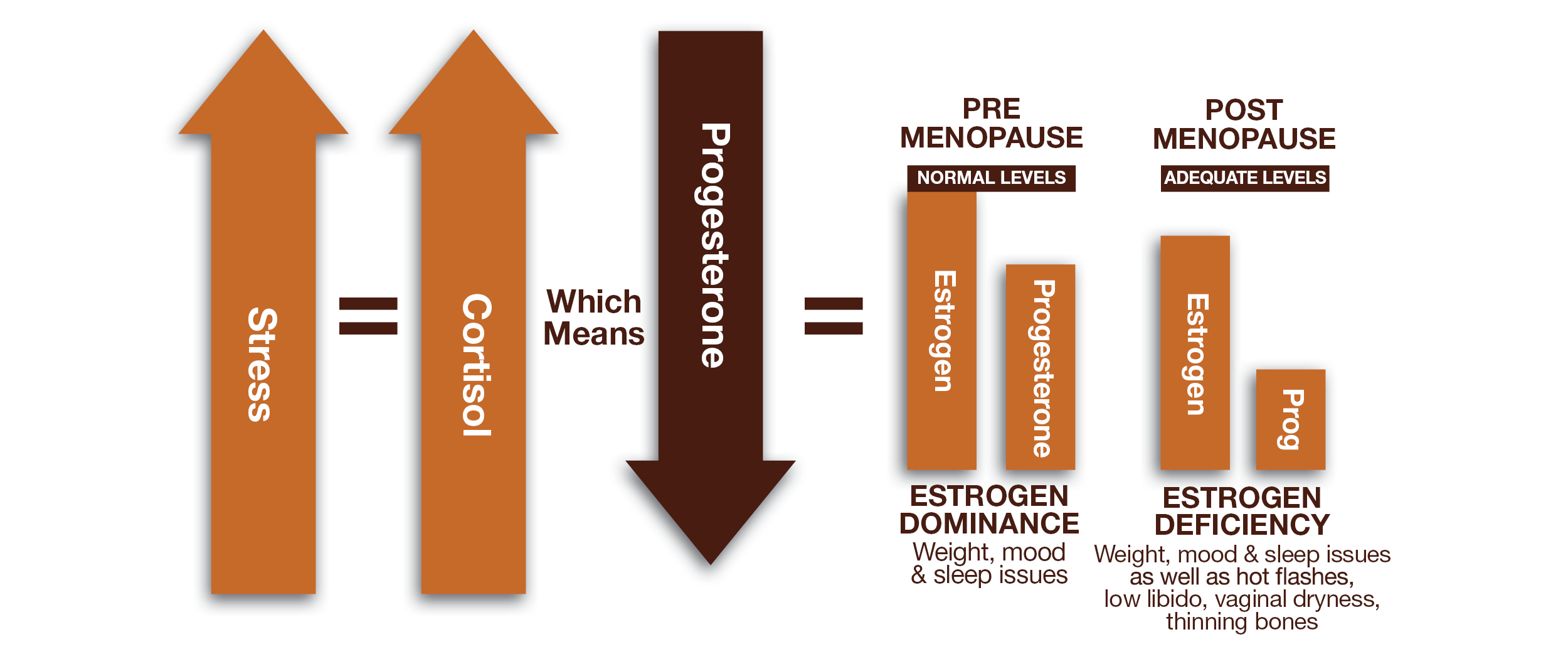 A stress hormone needed to buffer our bodies from the effects of stress. Cortisol itself is not a “bad” hormone but is problematic when we cannot produce enough of it to meet our needs. Simply, when our bodies can’t make enough cortisol to meet the demand, progesterone is stolen and converted into cortisol, leaving our bodies with a condition known as estrogen dominance. This condition lays the foundation for stubborn weight and PMS/menopausal symptoms.
